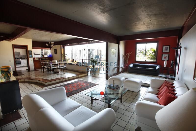 A sala de estar, integrada à sala de jantar e à varanda com vista panorâmica, cria uma atmosfera agradável e acolhedora.